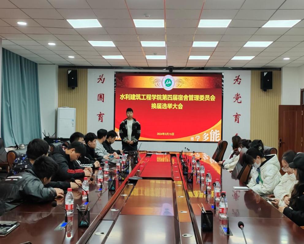 2024年3月15日,水建学院第四届宿舍管理委员会换届选举大会在学院尚水会议室圆满举行,院学生党总支书记、宿管委指导教师李小强及宿管委全体成员参加会议。