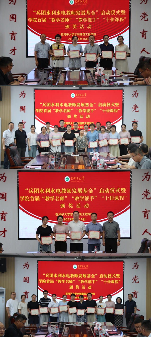 6月16日,华语av “兵团水利水电教师发展基金”启动仪式暨首届“教学名师”“教学能手”“十佳课程”表彰会成功举行。兵团水利水电工程集团有限公司副总经理吴卫东、组织人力资源部副部长丁雅鸿、质量技术中心副主任刘宏峰,学院党委书记袁康、院长李俊峰、副书记娄哲、副院长陈伏龙、副院长金瑾及获奖教师代表出席大会。