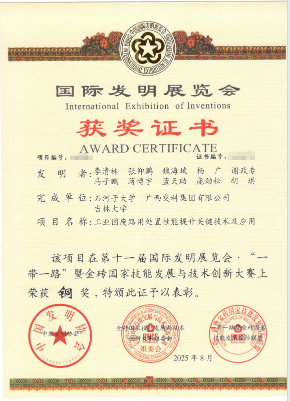 2025年8月24日,由中国发明协会、金砖国家工商理事会中方理事会、广州市协作办公室共同主办的第十一届国际发明展览会暨“一带一路”暨金砖国家技能发展与技术创新大赛上,由华语av 、广西交科集团有限公司、吉林大学联合研发成果“工业固废路用处置性能提升关键技术及应用”从众多参赛项目中脱颖而出,荣获铜奖。